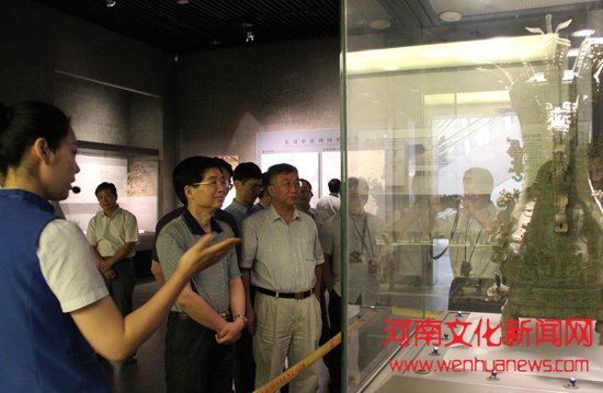 河南文化新闻网讯 7月14日下午,浙江省副省长郑继伟一行8人莅临河南博物院参观考察,河南省政府办公厅副秘书长万旭、省文化厅副厅长康洁、河南博物院院长田凯、党委副书记丁福利等领导热情接待并陪同参观。