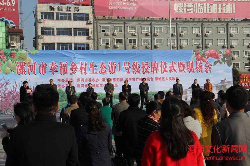 河南文化新闻网讯 为大力推动美丽乡村建设,加快推进乡村旅游发展,宣传推介丰富多彩的美丽乡村示范点,2016年11月3日上午,“漯河市幸福乡村生态游1号线”授牌仪式暨现场会在郾城区黄河广场举办,漯河市市委常委、统战部部长蒋志安、漯河市副市长栗社臣、市委农办主任罗静、市旅游局局长晁伟、市广播电视台台长尚桂林、市旅游局副局长李庆瑜、郾城区委副书记赵丹、郾城区政府副区长于宏等领导及各县(区)分管农村和文化旅游工作的领导、各县(区)农办主任、各县(区)文化旅游局局长、全市各乡镇镇长以及乡村旅游经营单位负责人及媒体记者共130多人出席了授牌仪式。
