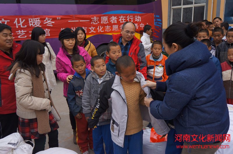 为更好地践行社会主义核心价值观,关爱帮助更多的困难群体,进一步发挥文化志愿者“服务社会、服务大众”的重要作用。自2014年起,每年的11月至来年二月,履涉新密、登封、新郑等偏远贫困山区开展“文化暖冬”,根据不同地区、不同需求的特点,坚持贴近实际、贴近生活、贴近需求,在文化志愿者及社会各界爱心人士的共同努力下,采取募集、购买等多种形式,为弱势群体送去棉衣棉被、生活用品、图书文具、课程辅导、精彩文艺演出等,坚持“暖身”、“暖心”双结合,坚持物质帮扶的同时予以精神关怀,实地解决基层群众的文化需求,使偏远地区的乡亲尽可能地享受公共文化建设成果。
