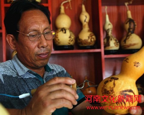 ,从小就喜欢画画,28岁时,他开始尝试在葫芦上绘画、烙画。他依照葫芦的形态,创作形、意契合的书画作品。他采用雕、绘、烙等技法制做出的葫芦工艺品,形态各异,构思巧妙,栩栩如生, 增加了葫芦艺术价值,十分惹人喜爱。(吴丽君 刘娣)