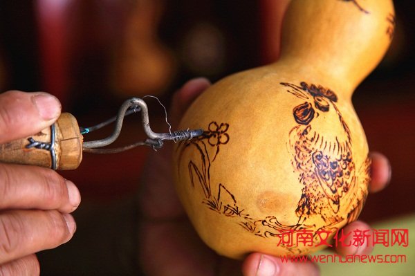 7月5日,社旗县民间烙画艺人魏解放采用电烙铁高温熨烫的技艺,在葫芦上创作葫芦烙画作品。