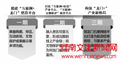 经过认真策划,“互联网+龙门”智慧景区项目分三期实施:一期搭建“互联网+龙门”信息平台。通过软硬件建设,普及互联网思维,搭建“互联网+龙门”信息平台,具备购票、导览、互动体验、文物保护成果展示等功能。二期打造“互联网+经营”产业平台、“互联网+文物保护”展示平台。进一步完善提升“互联网+龙门”项目,融入景区内部经营元素,形成较为完整的线上龙门景区产业链,探索“互联网+经营”模式;将更多文物保护成果通过互联网展示,将文物保护展示作为对龙门最好的宣传。三期构筑“龙门+”产业新格局。将龙门石窟网络平台打造为旅游信息枢纽,与更多产业、产品强强联合、共赢发展。