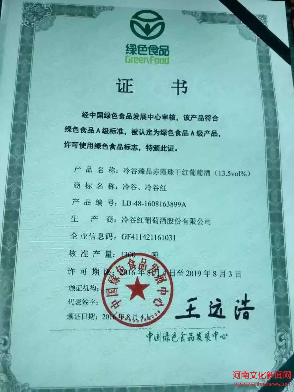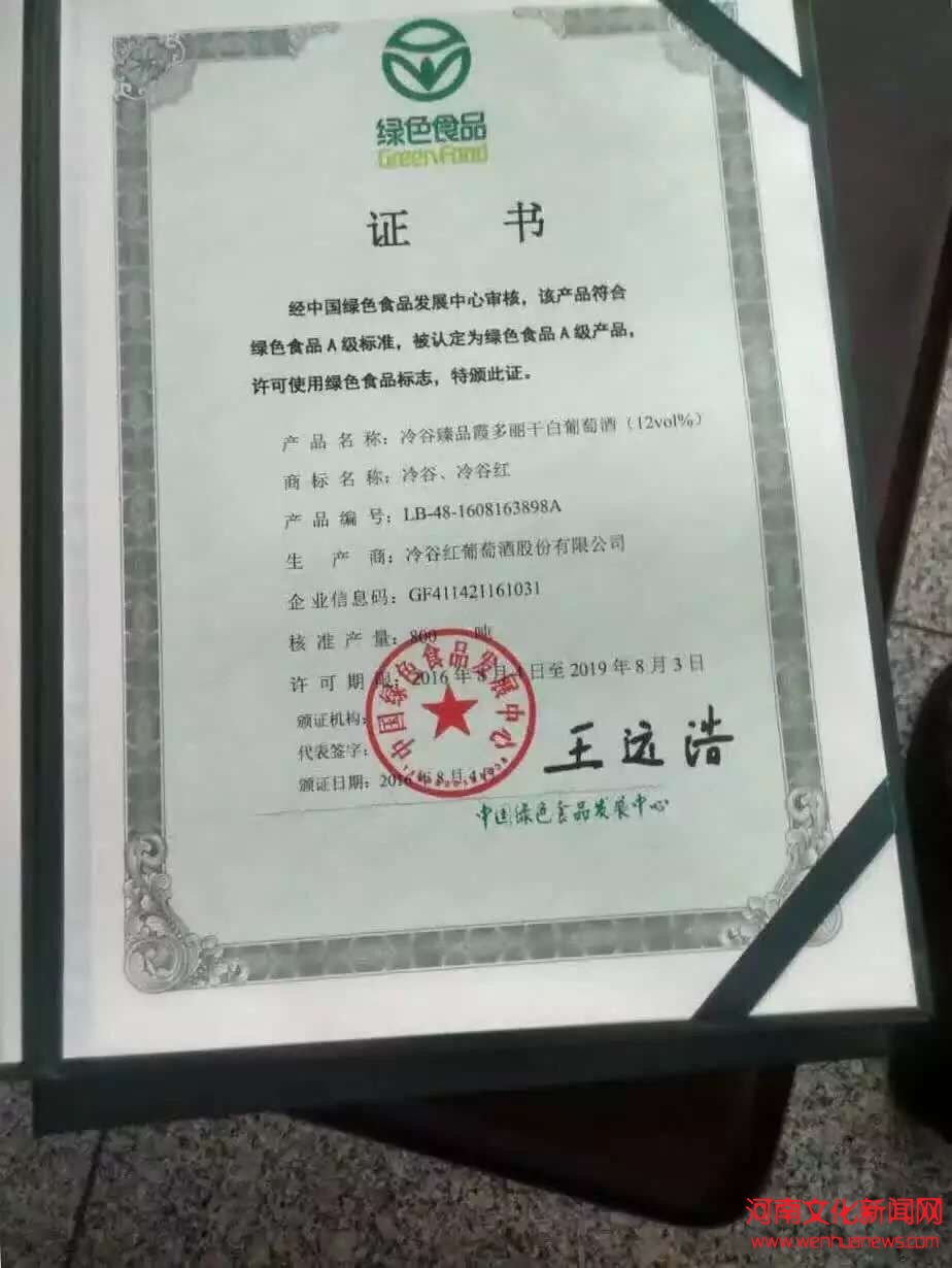 中国绿色食品发展中心认定为国家绿色食品A级产品,获得使用绿色食品标志许可。这是目前河南省唯一获得“国字号”绿色食品认证的葡萄酒类产品,也成为黄河故道葡萄酒发展以及“冷谷红”品牌崛起的又一个里程碑。