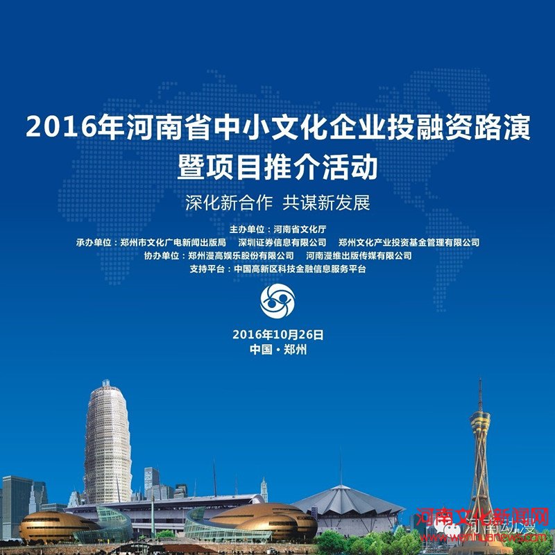 路演活动由河南省文化厅主办,郑州市文化广电新闻出版局、深圳证券信息有限公司、郑州文化产业投资基金管理有限公司承办,郑州漫高娱乐股份有限公司、河南漫维出版传媒有限公司协办,中国高新区科技金融信息服务平台提供平台支持。据主办方负责人表示,下一步将不断加大工作力度,持续构建文化企业与金融机构的沟通交流平台,为华夏历史文明传承创新区建设提供金融支持和项目保障,助推河南文化产业持续、健康、快速发展。(云中君)