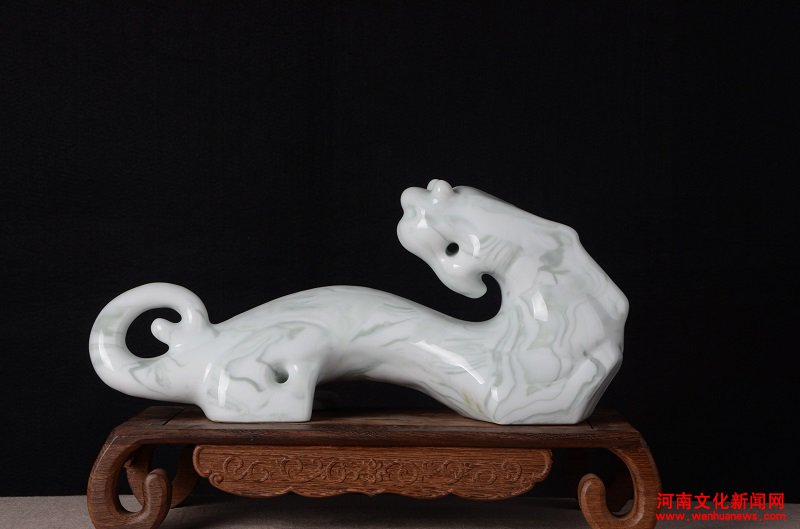 “龙是华夏的图腾,是一种独特的文化创造,精神的创造,符号的创造,本作品便是以中华龙为基本造型,采用两种不同的泥进行混合,流漏出自然的纹路,祥云般的花纹,表现出云龙在天,自然生动的艺术效果。”6月22日,在焦作的金谷轩绞胎瓷艺术有限公司展厅,其艺术总监柴战柱向记者介绍了他入选九年义务教育《美术》教材的《中华龙》作品。