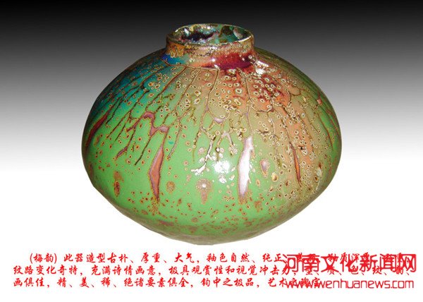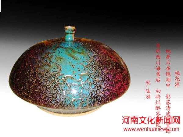 自钧缘阁成立之初,王秋红就走了一条源于传统而又打破传统的求索之路。钧瓷,凭借其古朴的造型、精湛的工艺、复杂的釉色、“入窑一色、出窑万彩”的神奇窑变,湖光山色、云霞雾霭、人兽花鸟等变化无穷的图形色彩和奇妙韵味,被誉为中国“五大名瓷”之首。钧瓷之美,美在窑变;变即是钧瓷的性格。而王秋红制钧瓷,从选材、造型、釉色、纹理到烧制出炉,都是在传承法古的基础上,重在突出一个“变”字。王秋红说:“‘变’是钧瓷的命脉,创新是钧瓷发展的唯一途径。”