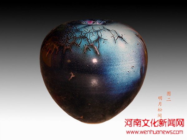 在王秋红的钧瓷作品上,釉色不再局限于“红白青蓝紫”和“蚯蚓走泥纹、珍珠点”的宋钧遗韵,更多的是以饱满浑厚、酣畅淋漓的釉质,通过炉火的煅烧来呈现前所未有的窑变效果,如厚重神秘的“黑唐钧”、文雅朴实的“鸽子蓝”和富有时代气息的“铁皮釉”、斑驳离奇的“火焰纹”……