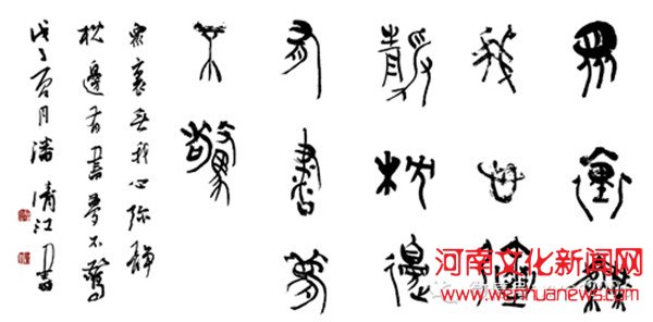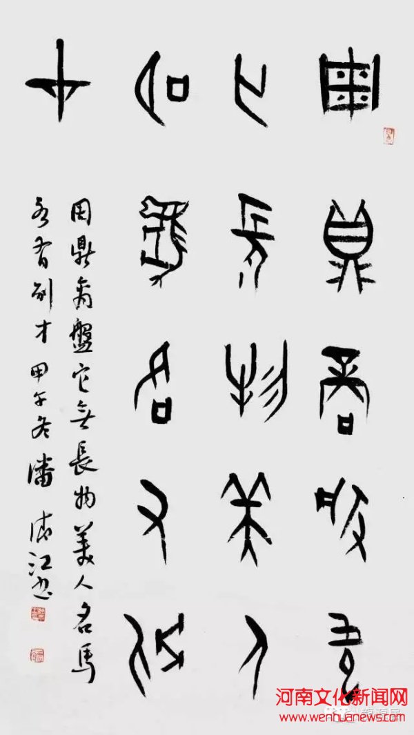 河南文化新闻网讯 潘清江书风以楷书、隶书为主,草书、篆书、行书诸体皆有独到之处。其书作用笔凝练精到,章法规整有序;线条丰润饱满、刚柔相济;意境深邃高远,回锋转笔奔放自如。