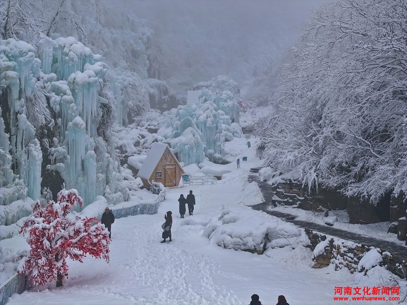峡谷内,3000米冰瀑群与白雪相映衬,宛如银装素裹的冰雪童话世界,冰瀑冰挂,蓝色冰川,延绵不断,吸引大批游客驻足欣赏。