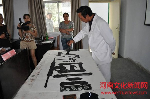 在听了付巧丽校长对学校的介绍后,张宝玉现场挥毫泼墨,书写了“天道酬勤”和 “海纳百川”等书画作品,并将作品义捐给登封市聋哑学校。