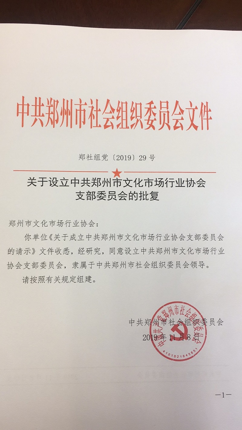 上午十点,成立大会在庄严的国歌中开始,根据《中国共产党章程》和《中国共产党支部工作条例》规定,按照中共郑州市社会组织委员会批复和筹备会决定,召开中国共产党郑州市文化市场行业协会支部党员大会。首先由毛海超同志代表中共郑州市社会组织委员会宣读《关于设立中共郑州市文化市场行业协会支部委员会的批复》(郑社组党〔2019〕29 号)随后由包士军同志向大会报告中共郑州市文化市场行业协会支部委员会筹备工作情况。