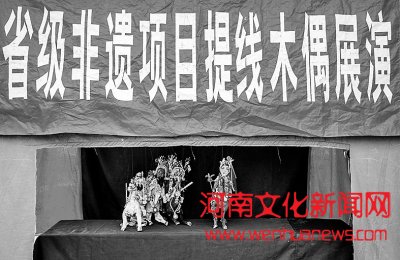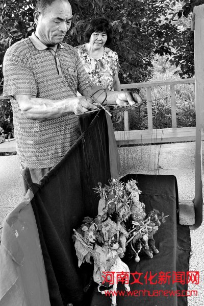 河南文化新闻网讯 7月26日,宝丰县赵庄镇周营村提线木偶传承人徐电营正在表演木偶戏。