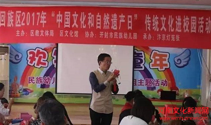 河南文化新闻网讯 6月7日上午,为迎接本周六的“中国文化和自然遗产日”由我区教文体局和文化馆主办的2017年“中国文化和自然遗产日”传统文化进校园活动在民族幼儿园开展,国家级非物质文化遗产--汴京灯笼张第七代传承人张俊涛先生为家长和孩子展示汴京灯笼传统制作工艺,并传授孩子们简单的灯笼制作技术。本次活动通过亲子的共同体验,使家长和孩子们认识了中国传统文化的艺术魅力,并在传承人口传身授的过程中亲身体验非遗制作技艺的趣味。下一步,我区将同“非遗”传承人一起,将民族传统艺术瑰宝送进更多的校园,让更多的学生体验到中华文化的博大精深。
