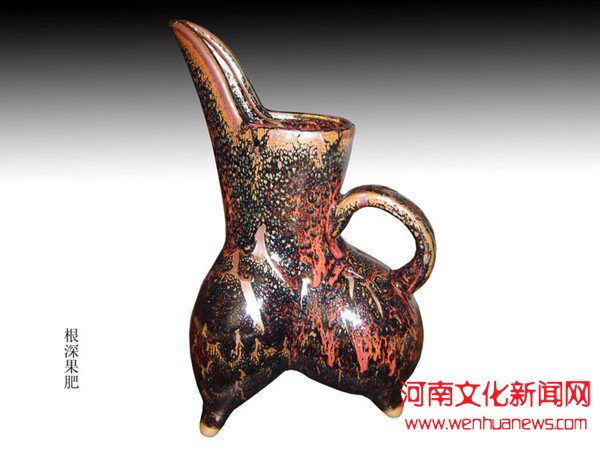 自钧缘阁成立之初,王秋红就走了一条源于传统而又打破传统的求索之路。钧瓷,凭借其古朴的造型、精湛的工艺、复杂的釉色、“入窑一色、出窑万彩”的神奇窑变,湖光山色、云霞雾霭、人兽花鸟等变化无穷的图形色彩和奇妙韵味,被誉为中国“五大名瓷”之首。钧瓷之美,美在窑变;变即是钧瓷的性格。而王秋红制钧瓷,从选材、造型、釉色、纹理到烧制出炉,都是在传承法古的基础上,重在突出一个“变”字。王秋红说:“‘变’是钧瓷的命脉,创新是钧瓷发展的唯一途径。”