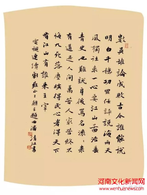 河南文化新闻网讯 潘清江书风以楷书、隶书为主,草书、篆书、行书诸体皆有独到之处。其书作用笔凝练精到,章法规整有序;线条丰润饱满、刚柔相济;意境深邃高远,回锋转笔奔放自如。