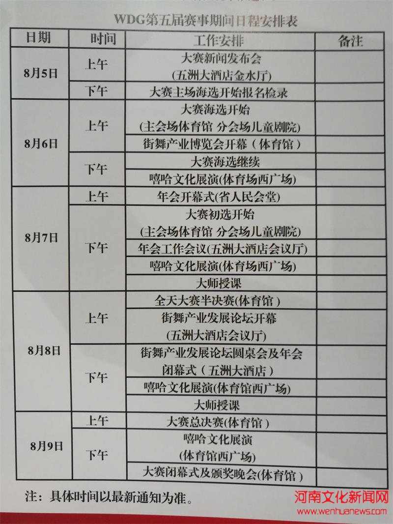 本届大赛期间将举办WDG第五届中国(郑州)国际街舞大赛总决赛、WDG第五届中国(郑州)国际街舞大赛颁奖仪式、中国舞蹈家协会街舞委员会第四届年会、国际街舞大师授课、Hiphop文化产业博览会、街舞文化产业发展论坛等主要活动。预期参赛选手将达到3万人,观众40万次,媒体传播将影响2亿人。