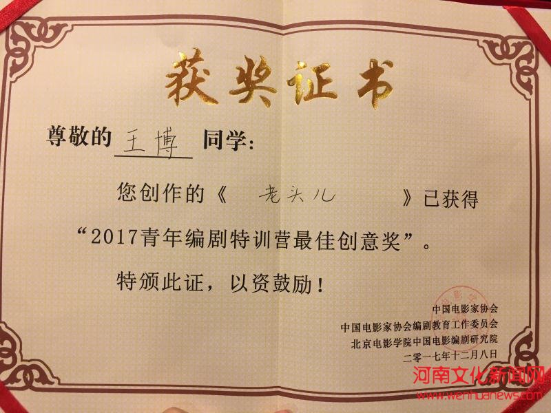 郑州大学新闻与传播学院教师、青年编剧王博,继2015电影剧本《唢呐奏鸣曲》获国家广电总局扶持青年编剧奖,这次电影剧本《老头》再获中国电影家协会、中国电影家协会编剧教育委员会、中国电影编剧研究员第一名创意奖。