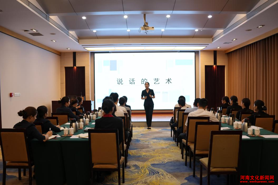 河南文化新闻网讯   为进一步提升宾馆员工的沟通服务能力,为宾客提供更优质的服务。8月28日,郑州融通紫荆山宾馆组织开展说话的艺术培训。