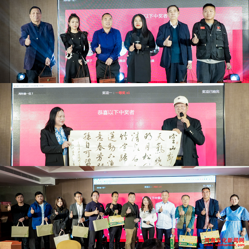 在抽奖环节,河南千茶万水文化传媒有限公司董事长朱焕丽开启了第一轮抽奖,10位三等奖幸运者获得了河南千茶万水文化传媒有限公司提供的古树白茶、河南稻香源供应链管理有限公司提供的稻花香大米。5位二等奖分别获得了,来自内蒙古宝丰源酒厂 蒙特泉酒业提供的价值3999元的龙年生肖酒一坛,3位一等奖分别获得了著名书法家郑延保老师的书法作品,惊喜奖获得了河南硬笔书法家协会主席司马武当的作品。