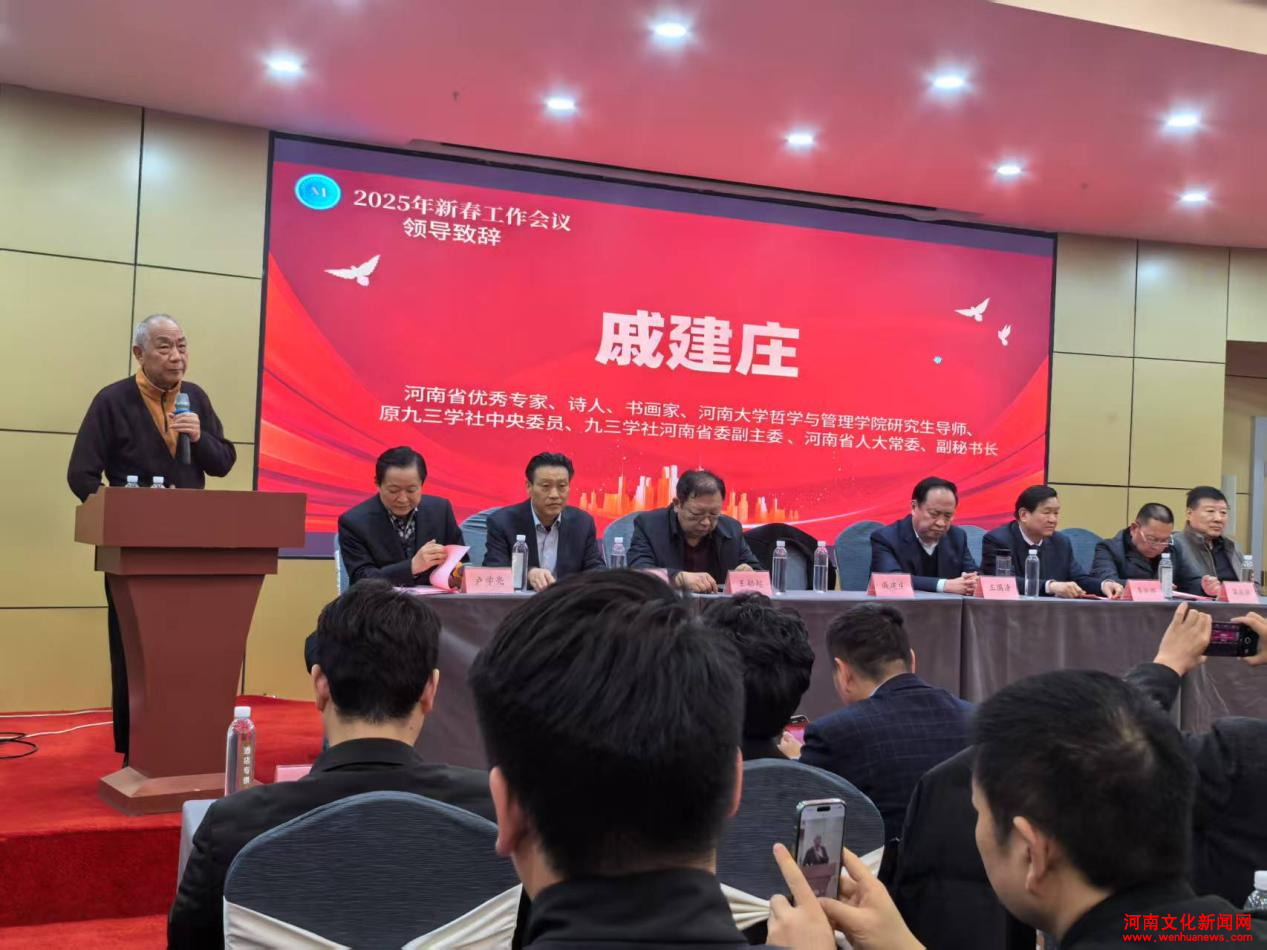 河南省优秀专家、诗人、书画家,河南大学哲学与管理学院研究生导师,原九三学社中央委员会委,九三学社河南省委副主委,河南省人大常委、副秘书长戚建庄在致辞中说:民营经济是推进中国式现代化的生力军,是高质量发展的重要基础。习近平总书记在民营企业座谈会上强调,新时代新征程民营经济发展前景广阔、大有可为,广大民营企业和民营企业家大显身手正当其时。希望河南省民营经济发展服务中心要深入学习领会习近平总书记关于民营经济发展的重要论述,从国家发展大局中找准自身定位,为民营经济发展做好创新服务工作。